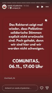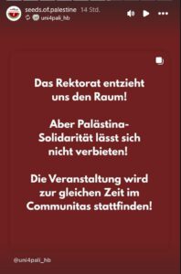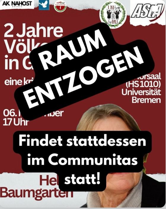 Die Rektorin der Uni Bremen hat die Nutzung des Kleinen Hörsaals (HS 1010) für die Veranstaltung mit Helga Baumgarten (sie sollte heute, 06.11.2025, online aus Jerusalem zugeschaltet werden) „zurückgezogen“. Die Veranstaltung wird trotzdem stattfinden, im COMMUNITAS-Raum unterhalb der Mensa. Mehr infos hier