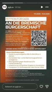An diesem Tag werden wir gemeinsam mit Unterstützer*innen in Bremen Plakate anbringen, Flyer verteilen und sichtbar auf die Petition aufmerksam machen. Jede Form der Teilnahme ist willkommen, ob durch persönliche Anwesenheit, Unterstützung beim Verteilen von Flyern, Druck Ressourcen oder das Auslegen von Informationsmaterialien in Ihren Räumen.“ Mehr Infos auf dem Instagram-Kanal der PGB