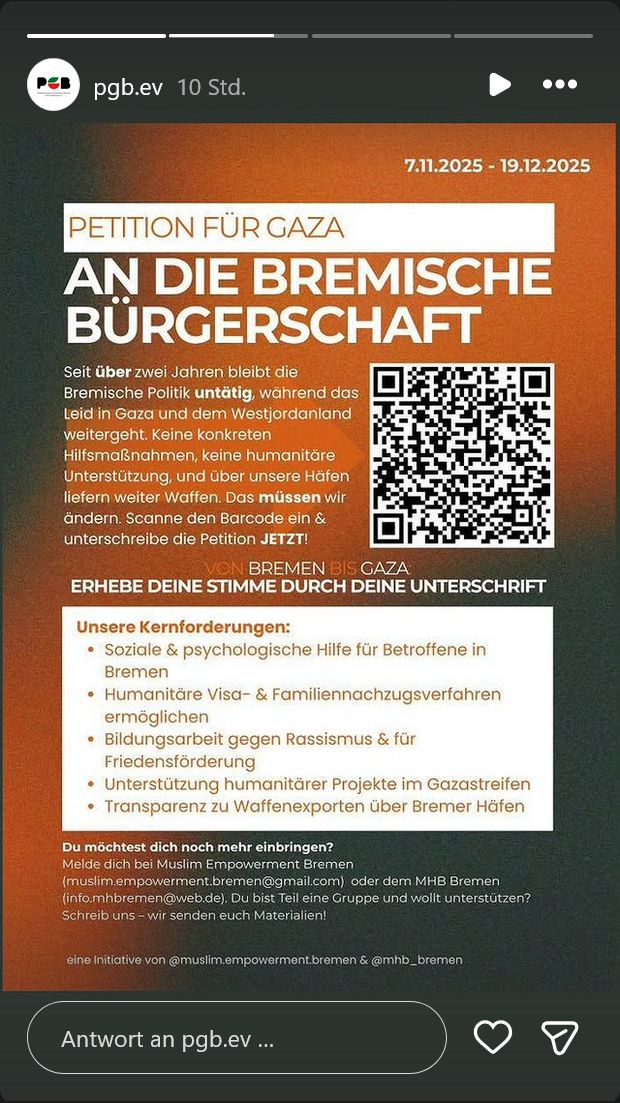 Der Muslimische Hochschulbund Bremen (MHB) gemeinsam mit Muslim Empowerment Bremen (MEB) hat in der Bürgerschaft Bremen eine Petition eingereicht und fordert alle auf, diese zu unterschreiben. Die Petition ist offiziell auf der Webseite der Bremer Bürgerschaft veröffentlicht und zur Mitzeichnung freigegeben. Hier zur Petition.