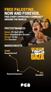 Die Palästinensische Gemeinde Bremen und Umgebung ruft auf zu einen „Stillen Marsch“ – FREE PALESTINE! FREE GAZA! In dem Clip auf ihrer Instagram-Seite heißt es: „Stiller Marsch – Lauter als je zuvor. Jahrelang waren wir laut. Wir haben gerufen, angeklagt, protestiert. Unsere Stimmen waren auf den Straßen. Und trotzdem wurde weiter geschwiegen. Während Du das hier liest, werden noch immer Kinder, Männer und Frauen ermordet, vergewaltigt, inhaftiert, vertrieben und gedemütigt. Ihr eigenes Land wird zerstört und gestohlen, ihre grundlegenden Rechte gebrochen. Wieder. Und immer wieder. Orte des Glaubens, Kirchen und Moscheen verschwinden. Die Al-Aqusa-Moschee wird geschlossen. Hoffnung wird geraubt. Die Todesstrafe für Palästinenser:innen wird eingeführt und das Morden damit noch einfacher gemacht. Still. Schritt für Schritt. Der vollständige Text hier.