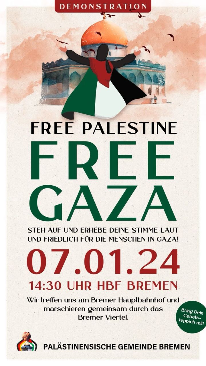 Veröffentlicht 8. Januar 2024 am 720 × 1280 in Palestine Will Be Free. Kundgebung und Demonstration am 7. Januar 2024 in Bremen