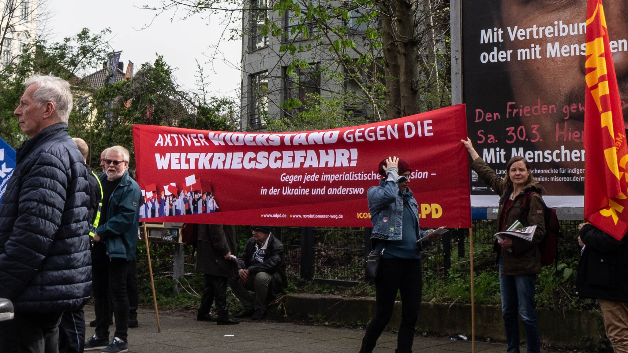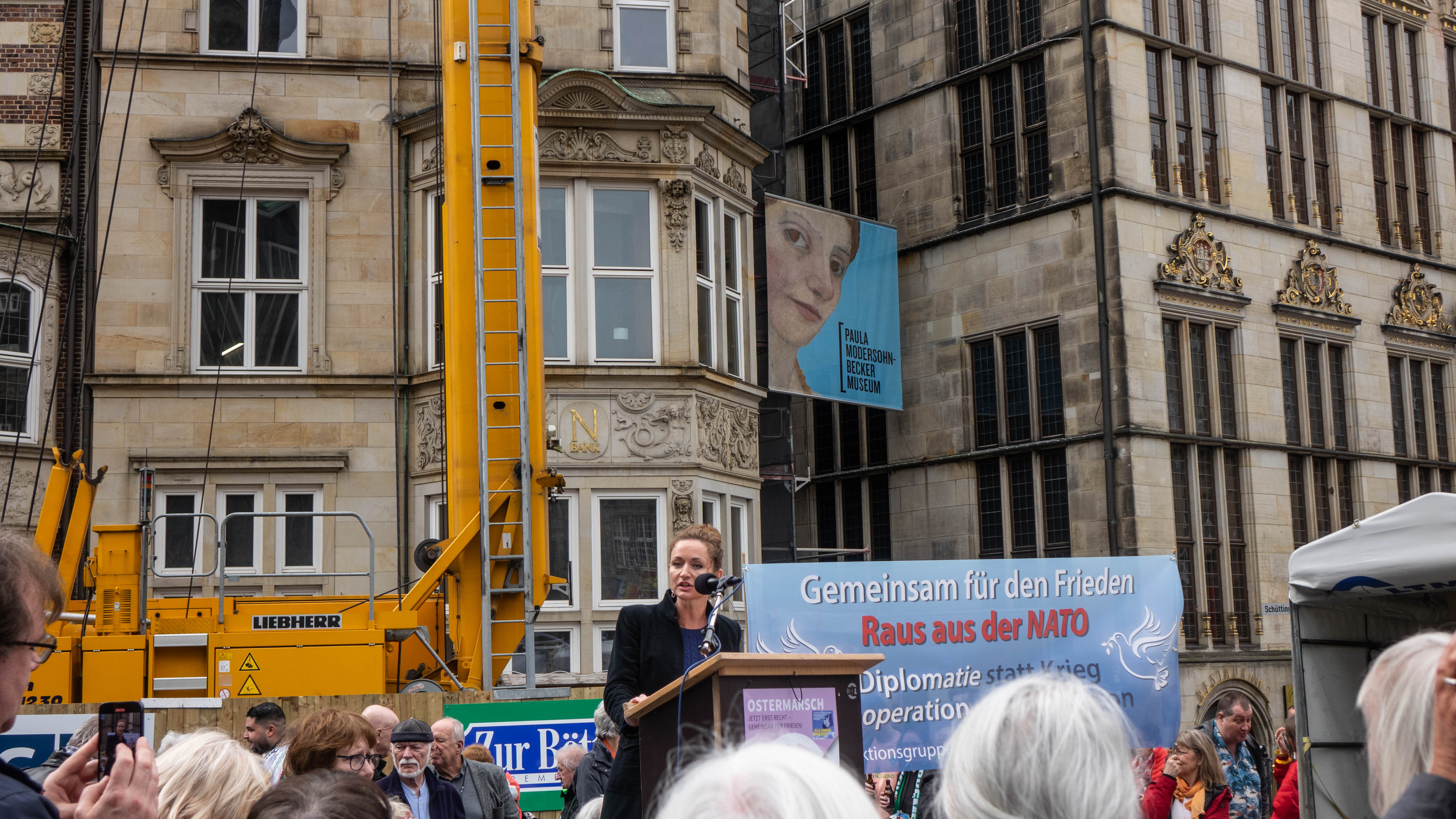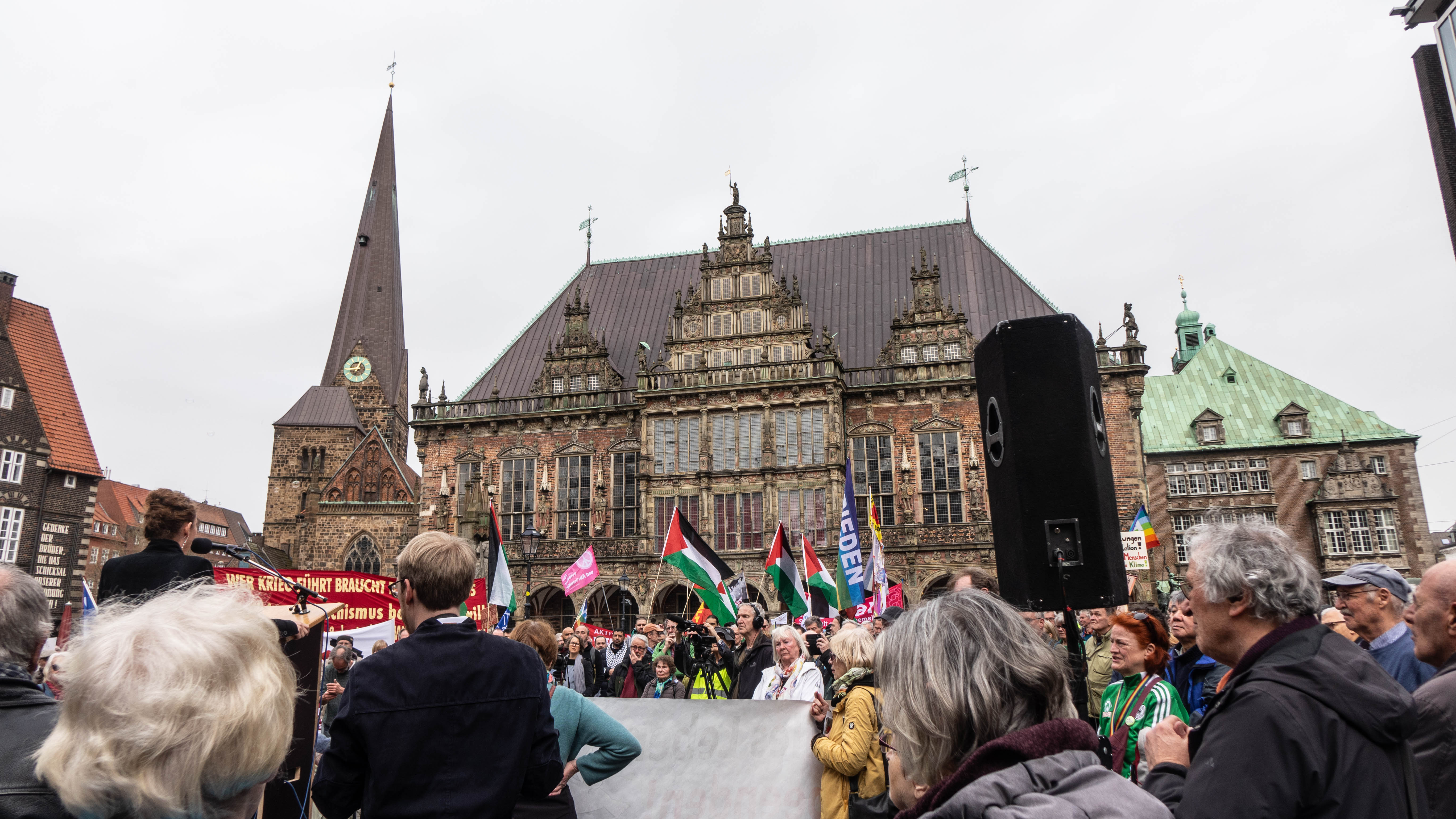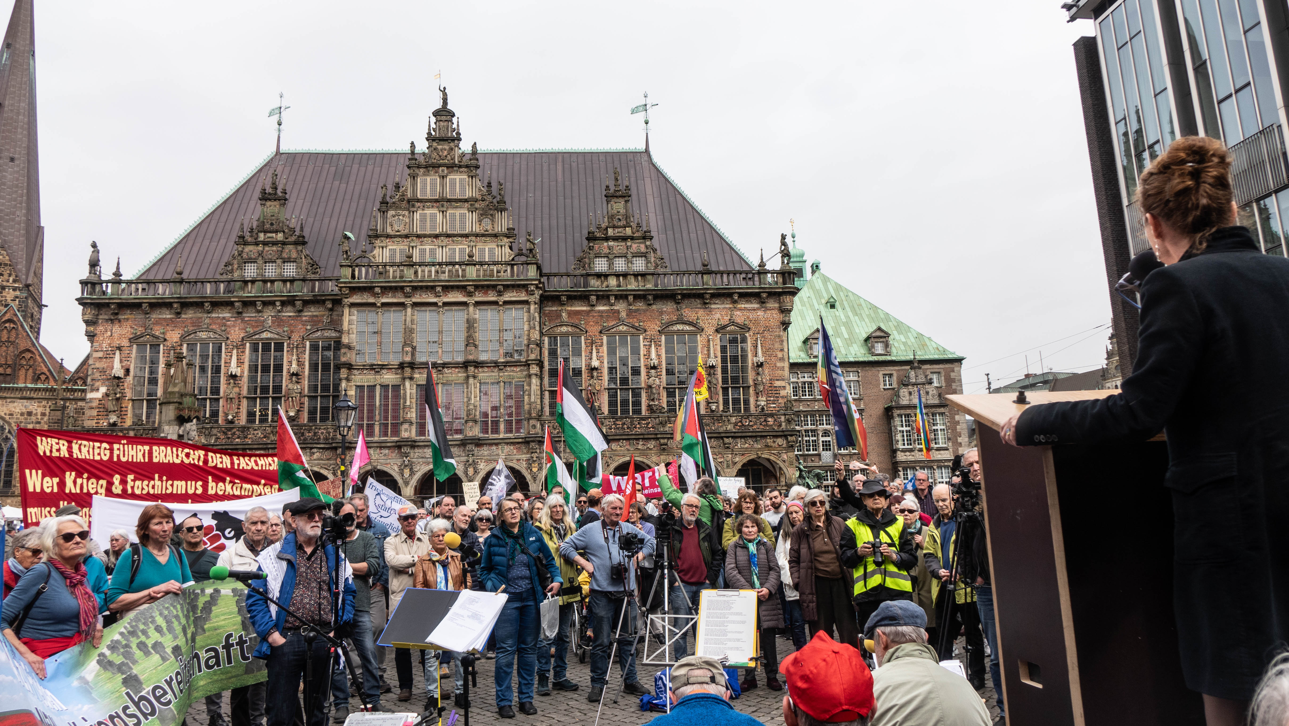 Etwa 2000 Teilnehmerinnen und Teilnehmer zogen in einem bunten Zug, erstmals unter großer Beteiligung der Bremer palästinensischen Gemeinde, vom Friedenstunnel an der Parkallee zum Marktplatz, um gegen Aufrüstung, Sozialabbau und die Kriegsbeteiligung Deutschlands am Ukraine-Krieg zu protestieren. Gefordert wurde ein sofortiger Waffenstillstand in Gaza und das Ende aller Waffenlieferungen an die israelische Armee. Auf der Schlusskundgebung hielt Zaklin Nastic, Bundestagsabgeordnete für das Bündnis Sahra Wagenknecht (BSW) eine mitreißende Rede, in der sie die „Kriegsbesoffenheit“ großer Teile der bundesdeutschen Politik anprangerte, wofür sie lebhaften Applaus bekam.