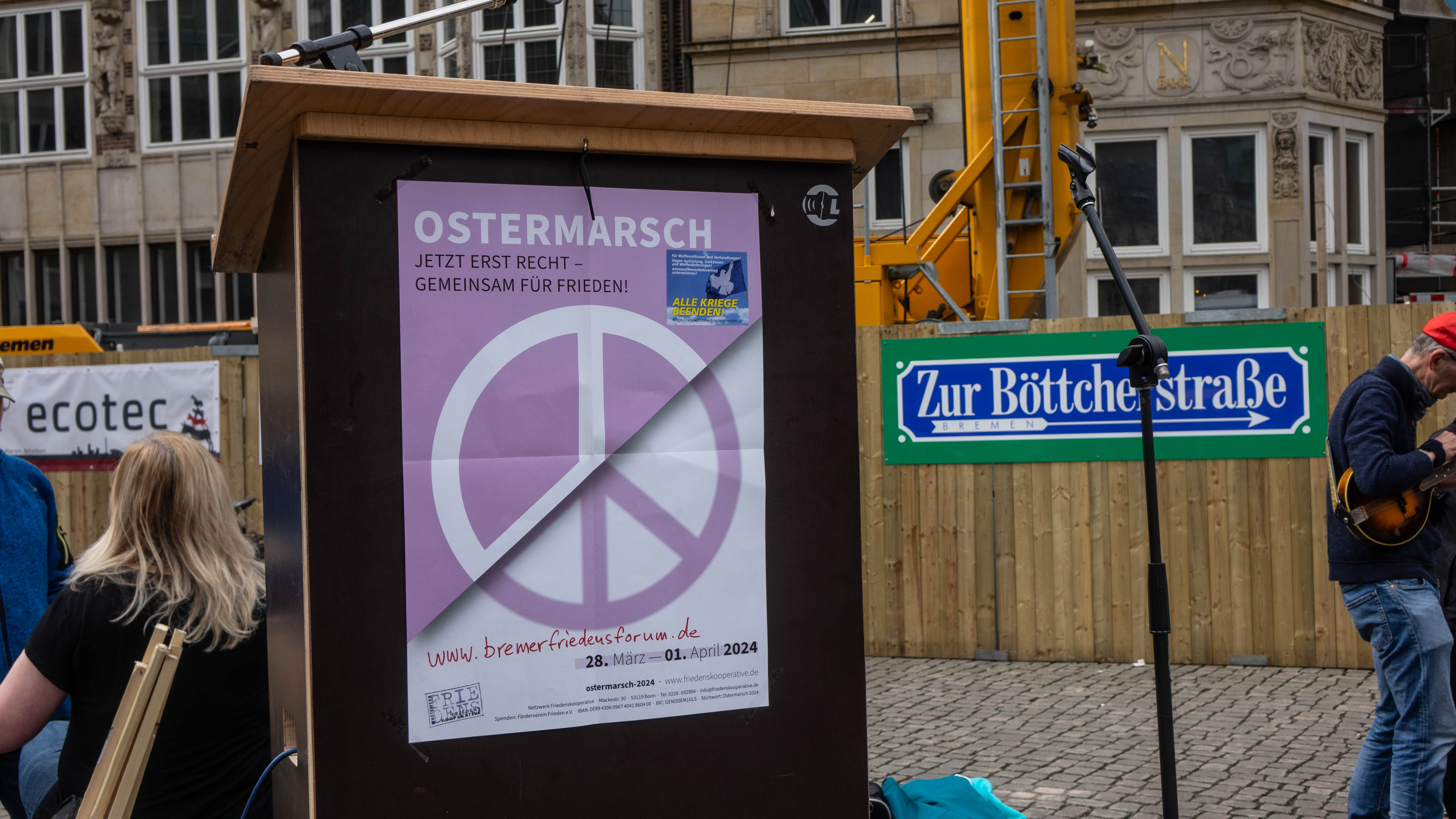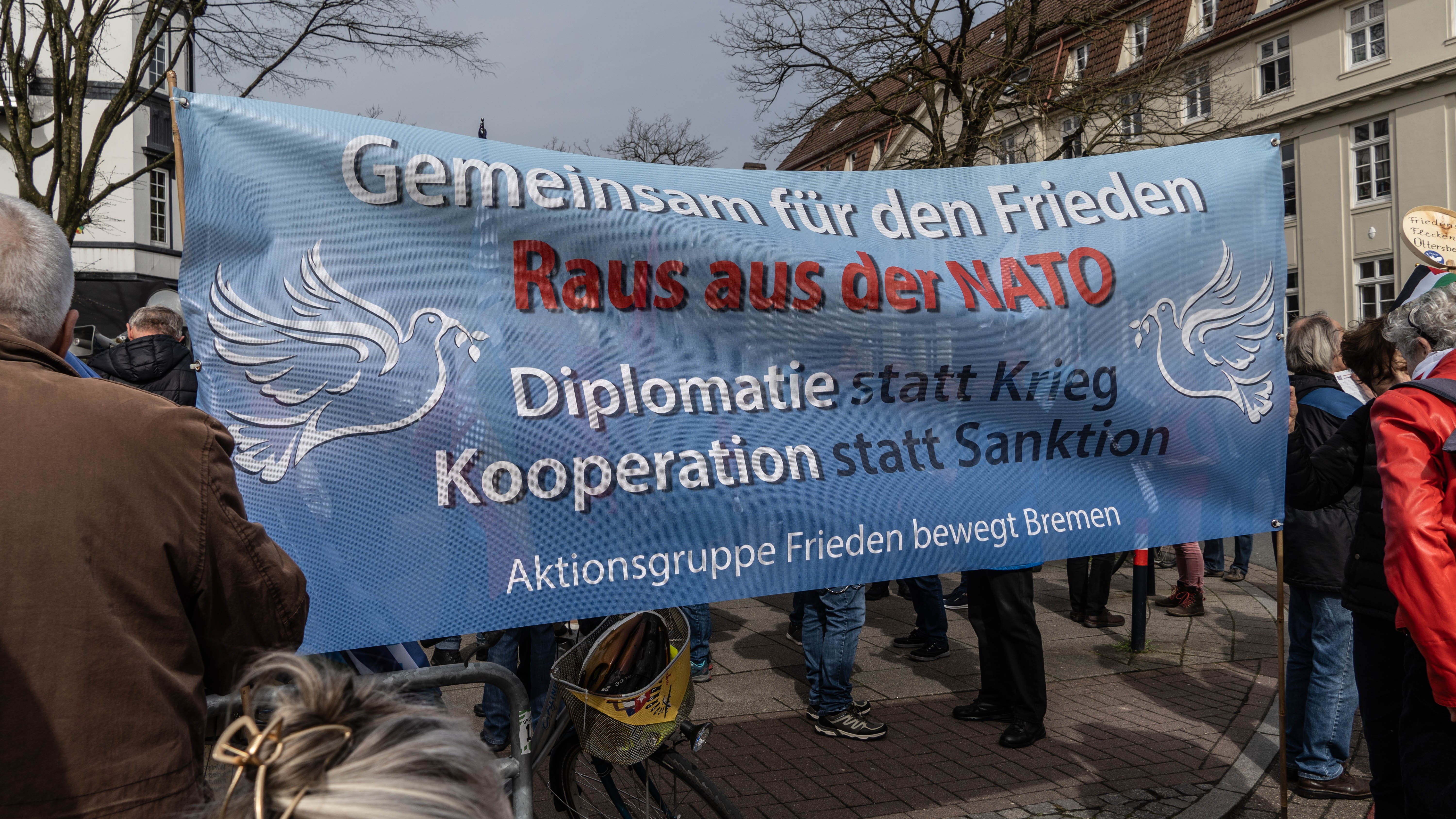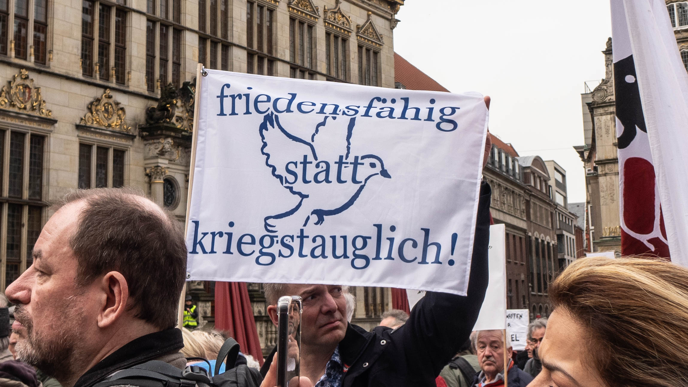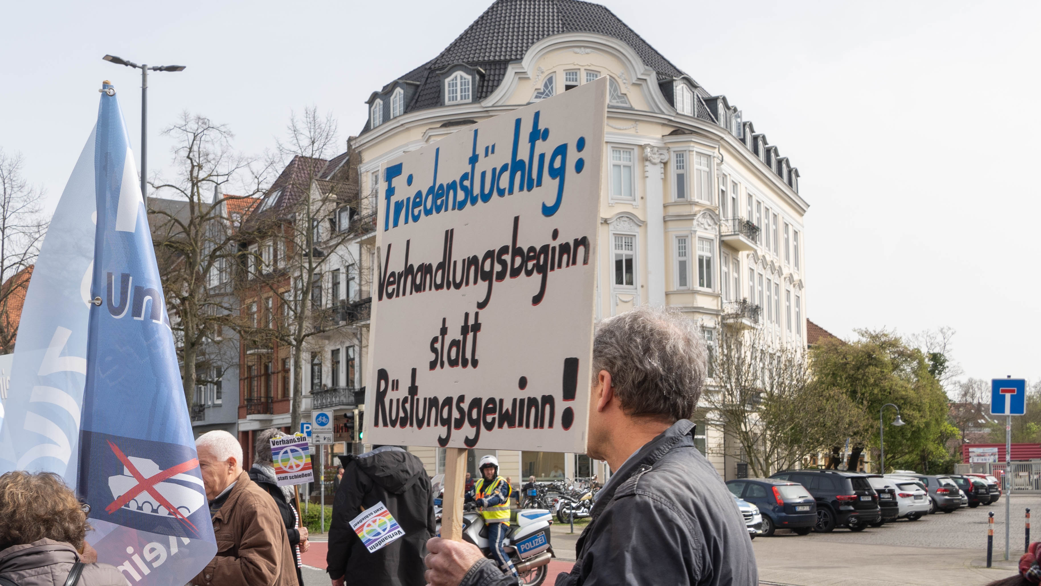 Das Bremer Ordnungsamt hatte zeitgleich eine Gegenkundgebung genehmigt. Die Sprecher setzten sich ein für weitere Waffenlieferungen an die Ukraine und lehnten Verhandlungen ab.