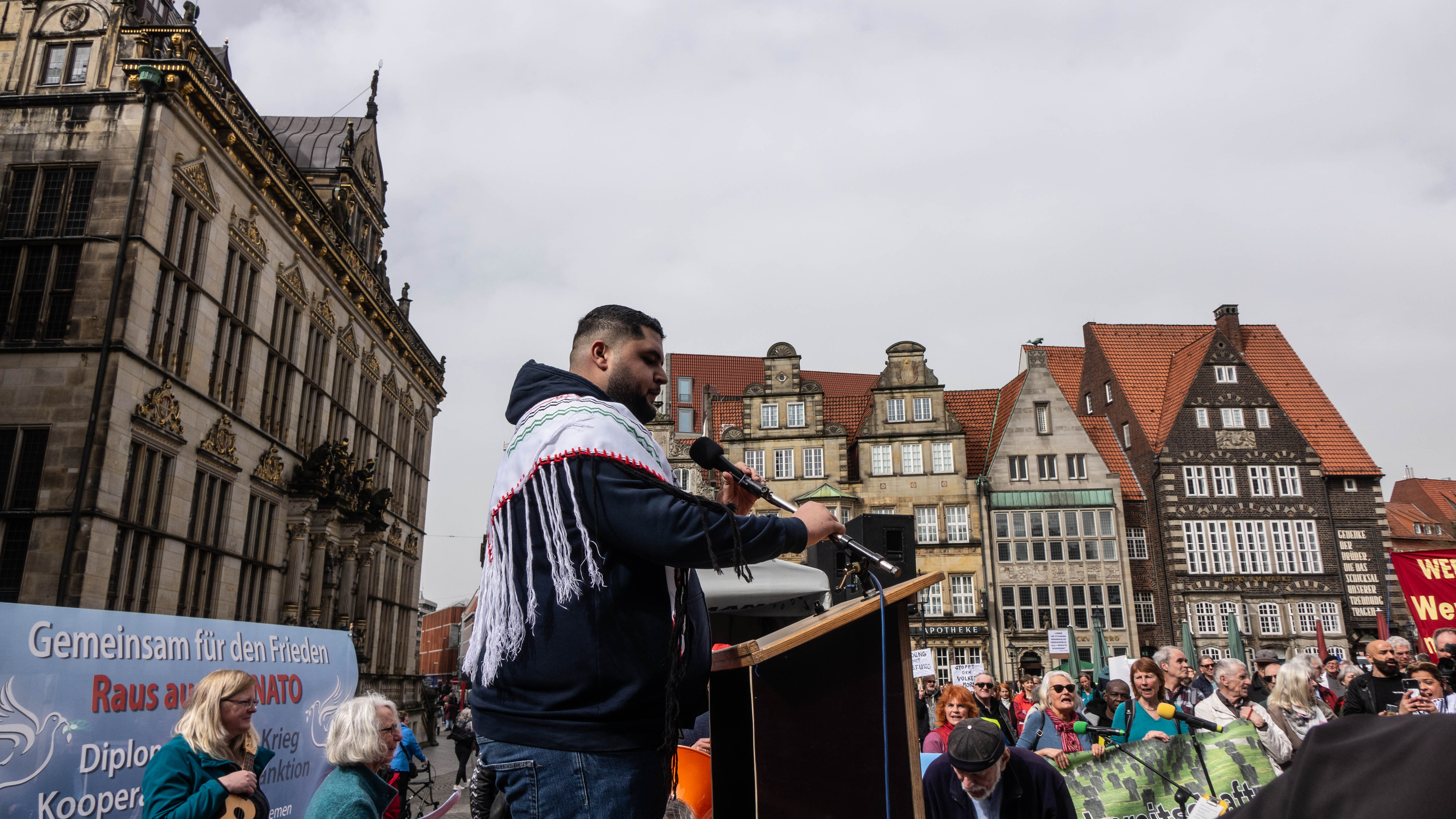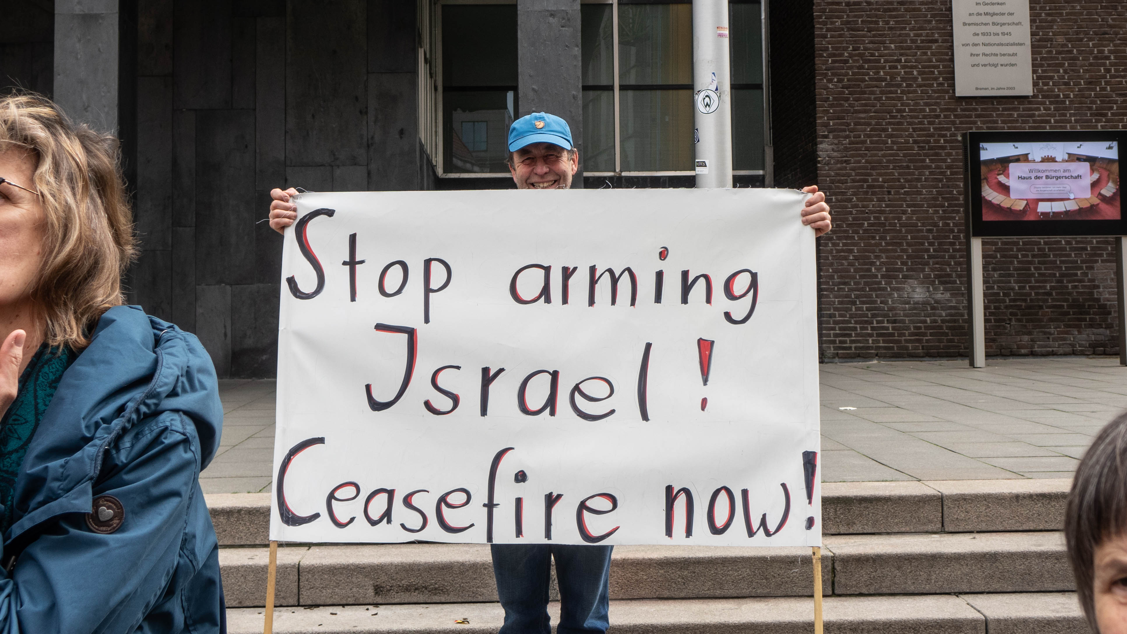 Im Anschluss daran sprach Ibrahim Aslan von der palästinensischen Gemeinde Bremen vom Leid der Zivilbevölkerung in Gaza und beendete seine Rede mit dem Appell an die Bundesregierung, die Palästinenser nicht im Stich zu lassen und keine Waffen mehr an Israel zu liefern.