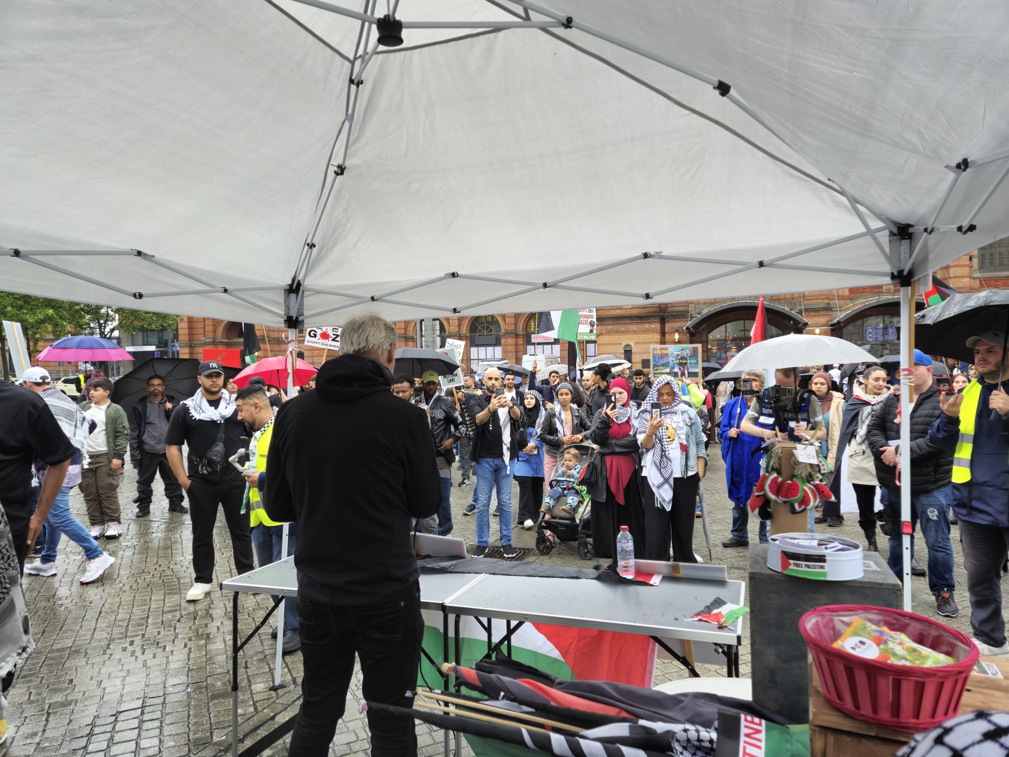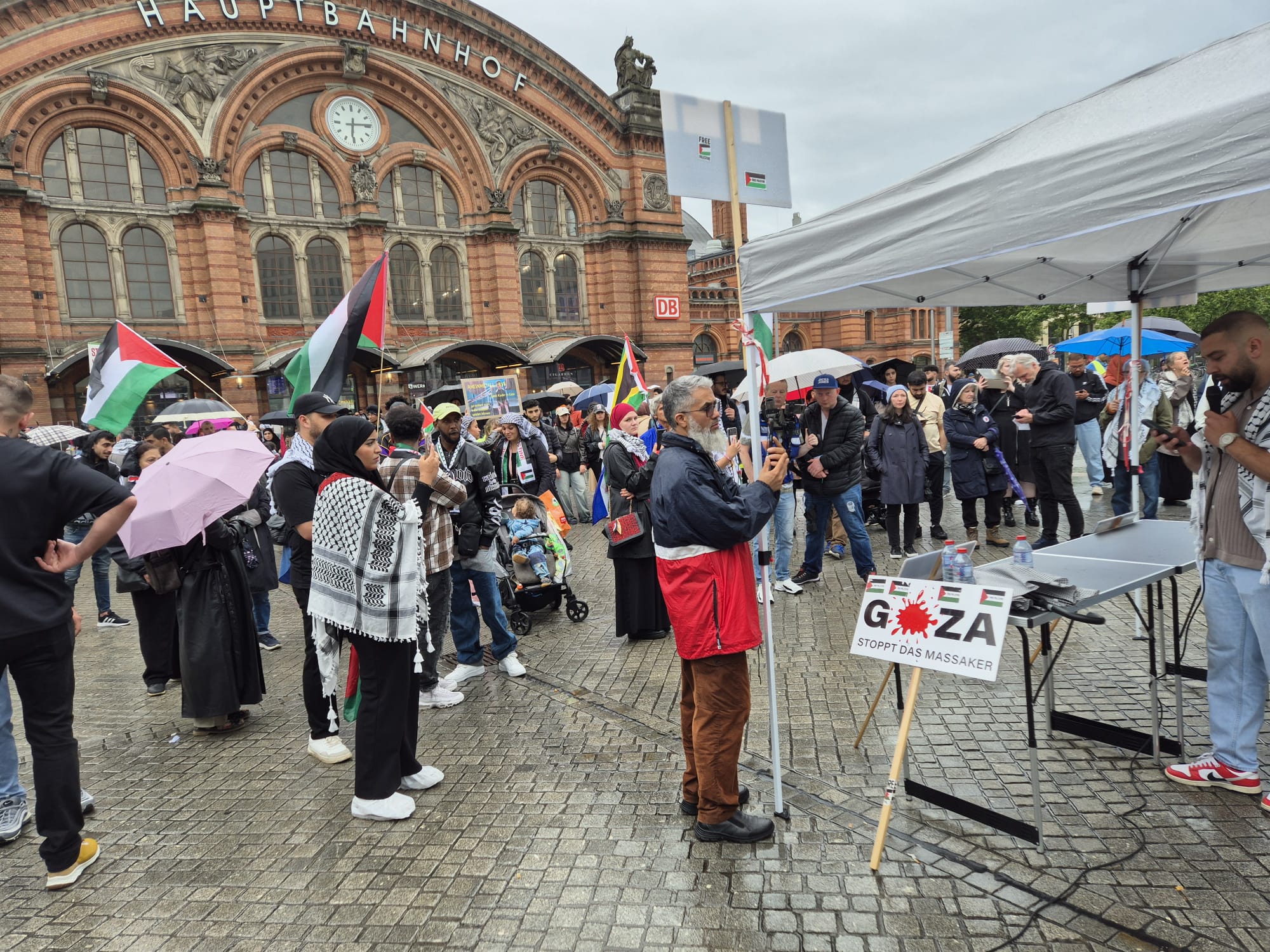 Für Freitag, den 21. Juni 2024, hatte die Palästinensische Gemeinde Bremen und Umgebung e.V. zu der 40. Friedens-Demonstration aufgerufen. Leider spielte die Wetterlage verrückt. In gewitteriger Luft und im strömenden Regen wurden auf dem Bahnhofsvorplatz in Bremen Reden gehalten und Interviews gegeben. Als Hauptredner war dieses Mal Dr. Markus Michelbrink vom Bremer Friedensforum eingeladen. Seine Rede befindet sich hier zum Download. Außerdem gab es noch einen sehr traurigen Redebeitrag von Ibrahim Aslan. Er berichete von dem kürzlichen Tod seiner Tante, die vor zwei Jahren aus Gaza kam und leider nie wieder zurück konnte. Nun ist sie in der Ferne verstorben…..