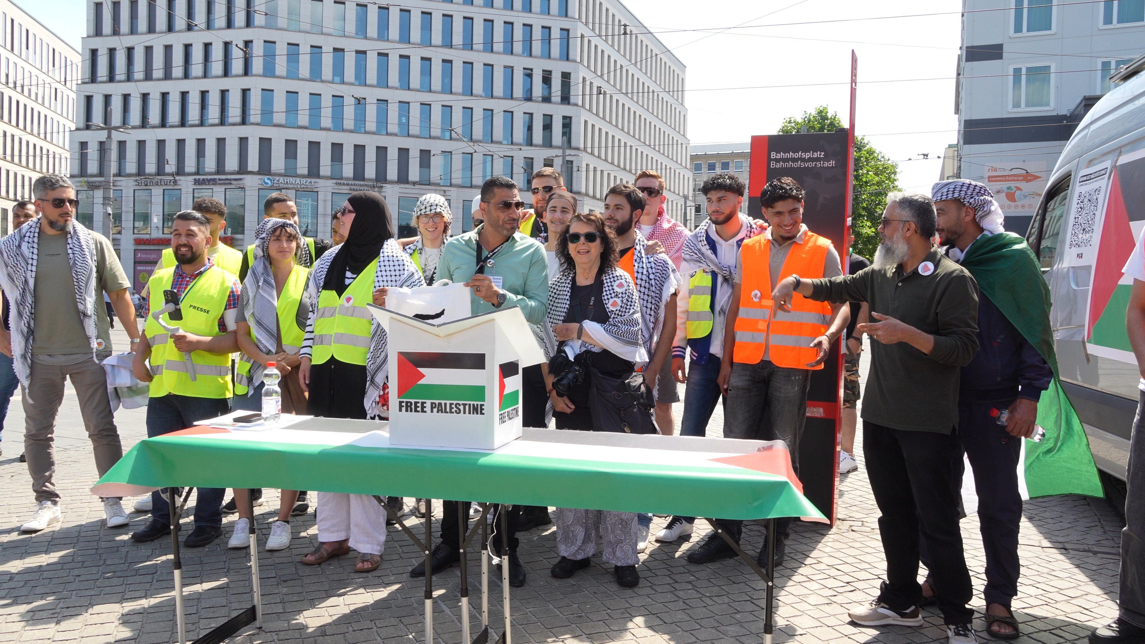 Marlies Hundt von der Deutsch-Palästinensischen Gesellschaft (DPG) hatte sich etwas Besonderes ausgedacht: sie rief alle Helfer und Helferinnen zu einem Gruppenfoto zusammen und überreichte dem Sprecher der Palästinensischen Gemeinde, Samer Aslan, ein kleines Geschenk. Deutlich machen sollte diese kleine Aktion, dass sich diese Demos Woche für Woche nicht von allein ergeben. Es braucht viele Überlegungen, den Aufruf, die Verbreitung, die Werbung über die social media, die Anmeldung (und Genehmigung) vom Ordnungsamt mitsamt Schildern, Transparenten, Lautsprecherwagen usw. usf.