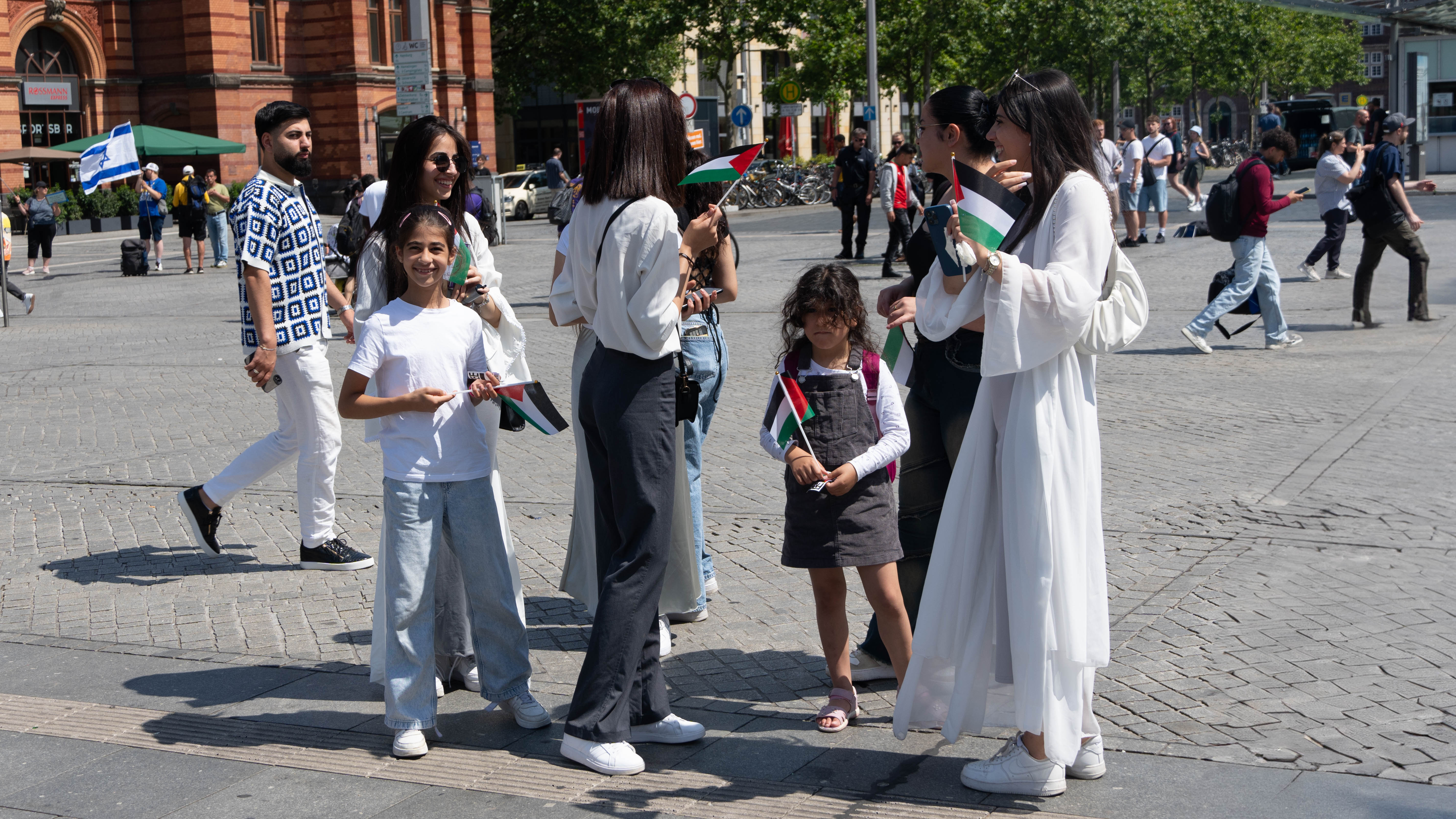 Dieses Mal hatte eine kleine Gruppe zur Gegendemo aufgerufen. Und: zur großen Verwunderung war die Gegendemo auch vom Ordnungsamt zur gleichen Zeit und ebenfalls auf dem Bahnhofsvorplatz genehmigt worden. Wenn es eine Provokation werden sollte, missglückte sie jedenfalls gründlich. Es kamen lediglich vier (!) Gegendemonstranten, die drei (!) Israelfahnen schwenkten.