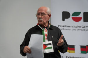 Zur Einleitung wies der Vorsitzende der DPG-Bremen, Dr. Detlef Griesche, in seiner Anmoderation auf die zunehmende Ausserkraftsetzung verfassungsrechtlicher Grundsätze wie Freie Meinungsäußerung und Versammlungsfreiheit und die Doppelmoral deutscher Politik durch das Mantra der „Staatsraison“ hin.