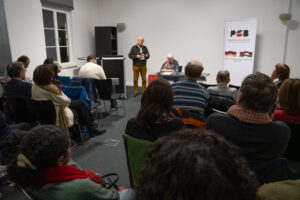 Sabine Broeck kritisierte in ihrem Vortrag die deutsche Wissenschaftslandschaft (ihre Institutionen, Verbände, Hochschulleitungen) für ihre Haltung zum anhaltenden Genozid in Gaza sowie der Terrorisierung der palästinensischen Bevölkerung in der Westbank. Das Spektrum von Reaktionen reiche dabei vom Schweigen in völliger Empathielosigkeit gegenüber der Vernichtung über Solidaritätsbekenntnisse zu neu geschaffenen Kooperationen mit dem Staat Israel, bis hin zu direkter Repression universitärer Proteste seitens studentischer Gruppen. Es wurde u. a. am Beispiel der Uppsala Declaration ebenfalls aufgezeigt, vor welchen Herausforderungen die Palästina-Solidarität an den Universitäten stehe. Sabine Broeck ging auch auf Vorkommnisse und Einstellungen an der Universtät Bremen ein und skizzierte an Hand eines aktuellen Beitrages aus etos media die Verflechtungen der Universität mit Raumfahrt- und Rüstungsbetrieben in Bremen sowie der zunehmenden Forschung auf diesem Sektor.