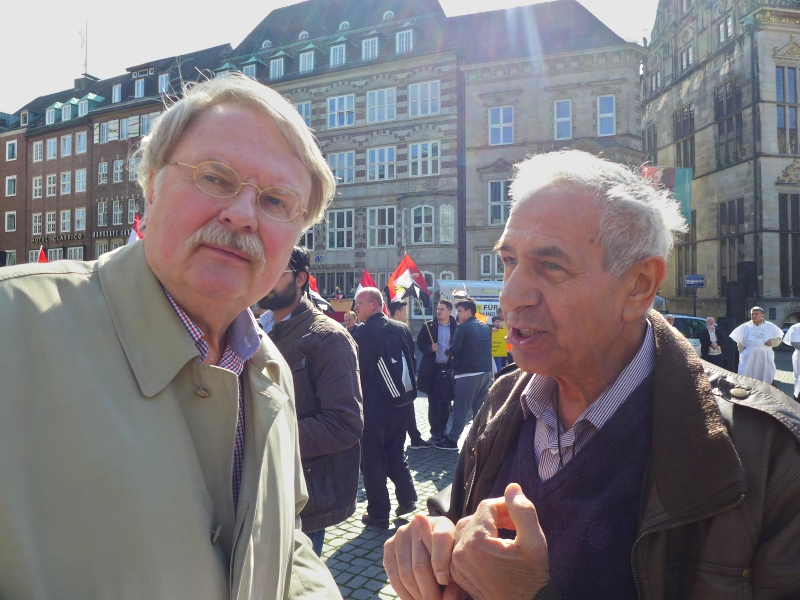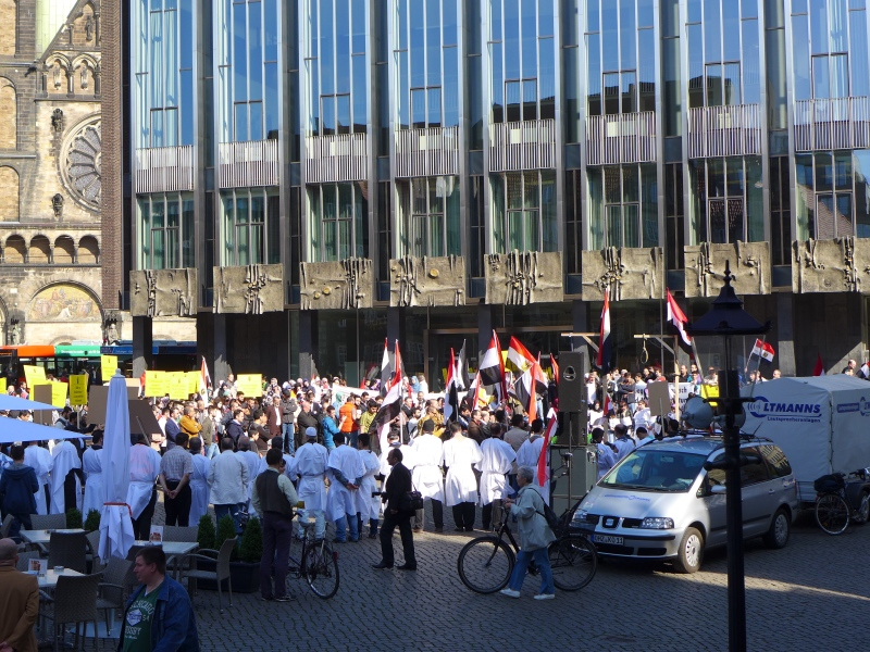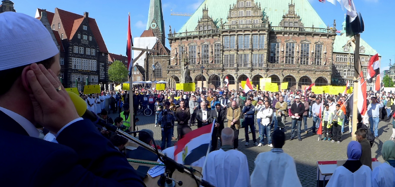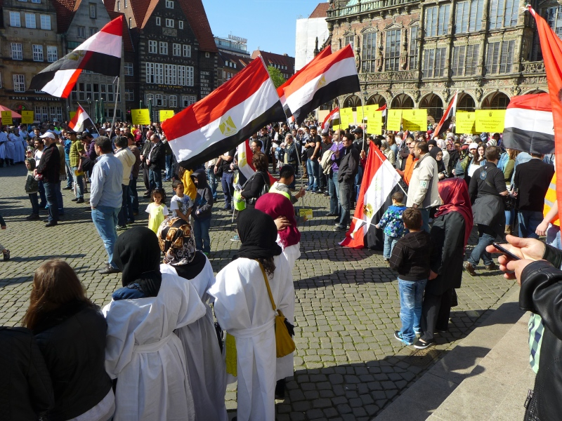 Die Verhältnisse in Ägypten sind aus den hiesigen Medien fast vollständig verschwunden. Deshalb hatten die wichtigsten islamischen Organisationen in Bremen, die Schura Bremen als Dachverband der islamischen Religionsgemeinschaften, das „Netzwerk für Frieden“, die „islamische Konföderation“ und die Vereine der DITIB (die Türkisch-Islamische Union der Anstalt für Religion) am 16. Mai 2014 um 16.30 Uhr zu einer Kundgebung auf dem Marktplatz aufgerufen. Ungefähr 800 Menschen, davon die meisten Muslime waren dem Aufruf gefolgt. Viele hatten sich im Halbkreis vor dem Rednerpult in weißen Umhängen, der Farbe der Trauer, aufgestellt. Auf Schildern waren die Namen der zum Tode verurteilten oder von der Polizei oder dem Militär schon umgebrachten Menschen in Ägypten zu lesen.